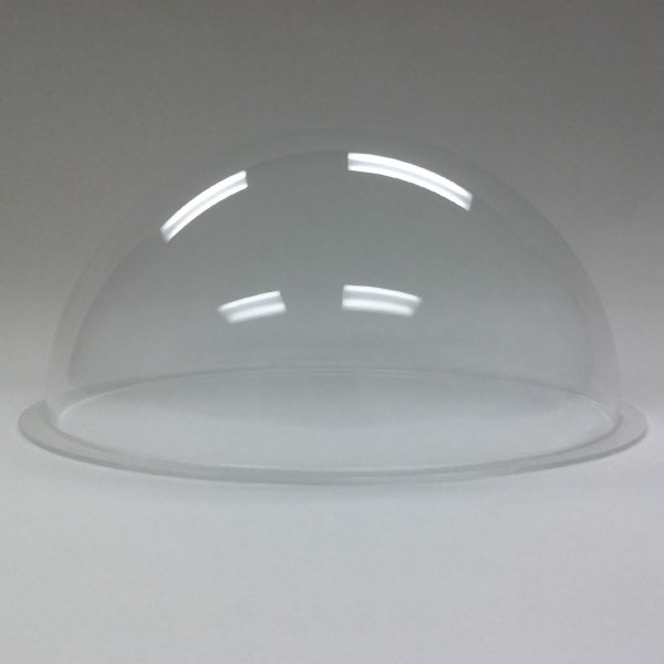 We stock hemispheres – Click To Shop In Stock Hemispheres – and our stock plastic hemispheres are fabricated from 1/4″ thick, clear acrylic (The 4″ hemisphere is fabricated from 1/8″ thick, clear acrylic.). As the plastic is stretched to make the hemisphere, the leading edge of the hemisphere will shrink to about 3/16″ thick, and the apex (top) may be as thin as 1/16″
